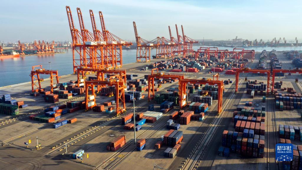 12月7日拍攝的唐山港京唐港區(qū)集裝箱碼頭一角(無人機照片)。新華社發(fā)(李磊 攝)