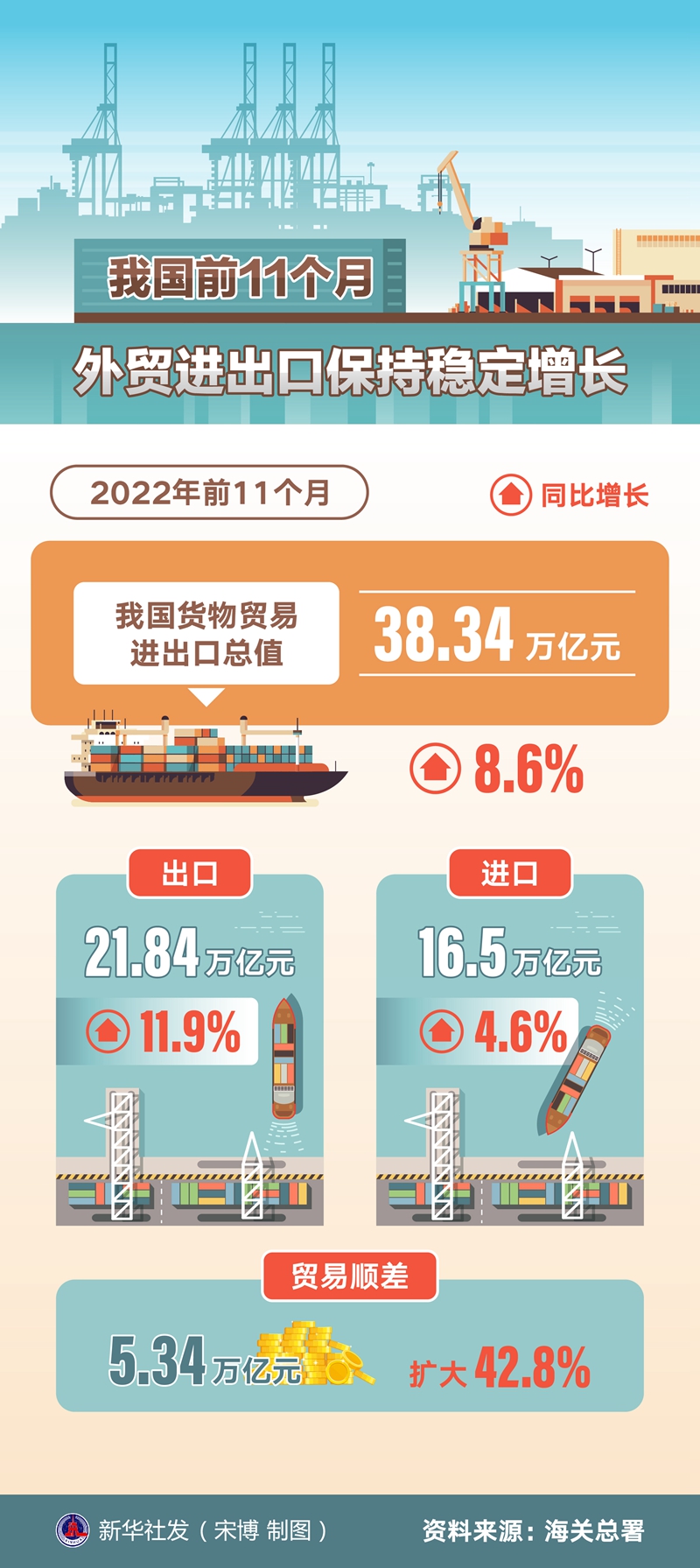 新華社北京12月7日電(記者鄒多為)海關(guān)總署7日發(fā)布數(shù)據(jù):今年前11個月,我國貨物貿(mào)易進(jìn)出口總值38.34萬億元,同比增長8.6%。其中,出口21.84萬億元,增長11.9%;進(jìn)口16.5萬億元,增長4.6%;貿(mào)易順差5.34萬億元,擴大42.8%。